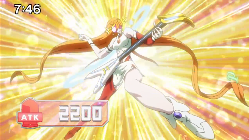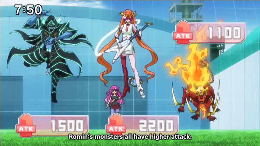 The duel continues. Romin summons another monster, then she uses the effect of her Prima Guitarna. Romin pays 1000 life points in order to activate its effect: This turn, all monsters on her side of the field gain 300 attack for every monster her opponent controls. With three monsters on Yuga’s side of the field, all of Romin’s monsters will receive a 900 attack point boost. Romin uses all the monsters on her side of the field to attack all of the monsters on Yuga’s side of the field and leaves him with 600 life points.