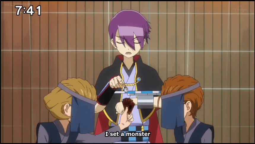 Gakuto draws 3 cards. Gakuto sets two more monsters face-down and tributes them in order to summon his ace – Fiendish Commander, Yameruler. Gakuto uses a spell card called Bandaged Bowing to switch Yameruler into Defense Position and draw 1 card. Then he activates Yameruler’s effect. The effect allows Gakuto to switch Yameruler into attack mode and prevent Level 7 or higher monsters from being tribute summoned. This means that Yuga can’t tribute summon his Sevens Road Magician. Next, Gakuto summons Binding Chain and tributes it in order to summon Shameful Striped Sage. Gakuto activates Shield & Sword to switch the ATK and DEF points of all monsters on the field. (Another return of an old classic.) Gakuto attacks Fire Golem with Shameful Striped Sage and Dark Sorcerer with Fiendish Commander, Yameruler. This leaves Yuga with only 300 life points. Gakuto ends his turn.