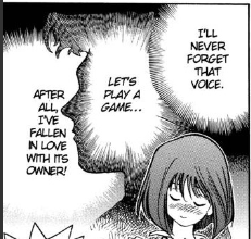 “Who was that man who saved me,” Anzu asks herself, “I’ll never forget that voice. After all I’ve fallen in love with its owner.”
