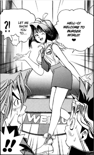 “Hello! Welcome to Burger World!” says Anzu, “Let me show you to…your…seats.”