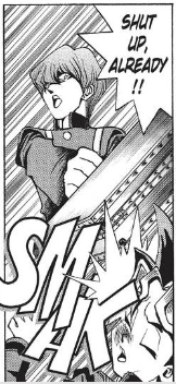 Yugi’s injury causes him to transform into his alter-ego. He says, “It seems I’ll have to teach you a lesson with a shadow game!”
