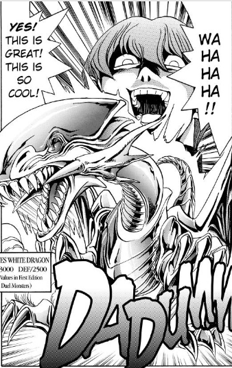 “I’ve got a special card I’ve been saving…the Blue Eyes White Dragon! The rarest card on earth!!” says Kaiba.