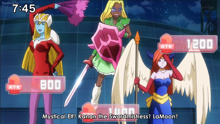 These monsters are all Rush Duel versions of original Yu-Gi-Oh! cards; namely Mystical Elf, Kanan the Swordsmistress, and LaMoon respectively.