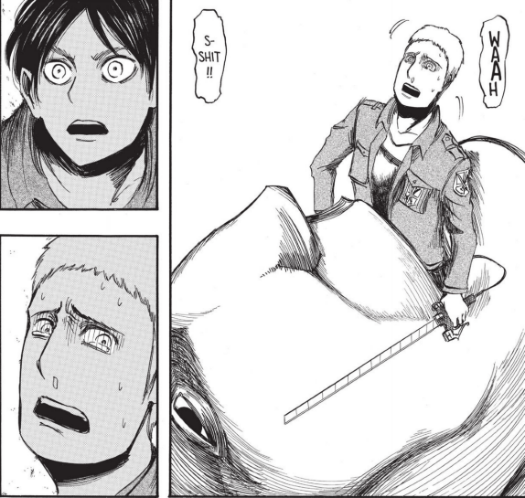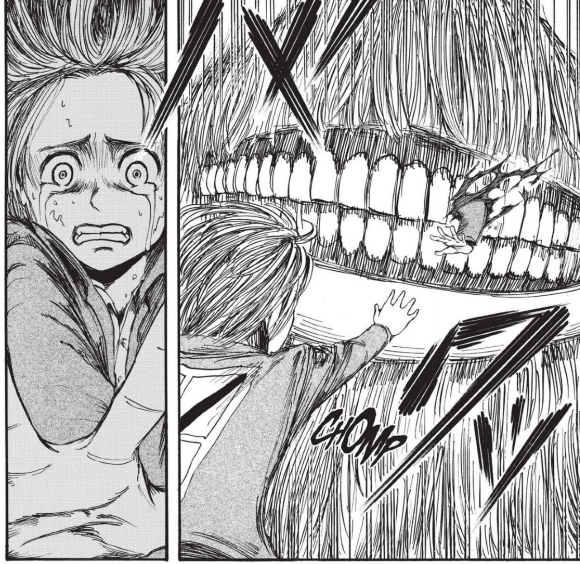 Armin can do nothing but stay frozen. Why do I have to watch my comrades being eaten, he thinks. Armin even stays frozen as a titan comes up to him, picks him up, and dangles him over its mouth. Why won’t my body move? he thinks. Armin only unfreezes when he lands on the titan’s tongue and starts sliding down its mouth.