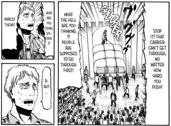 Meanwhile, a fight is breaking out at the gate that leads out of Trost. A merchant is trying to get his cart through, but it’s blocking the people from escaping.