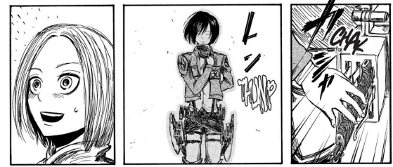 “Thank you sir,” says Mikasa, “but in my haste, I blunted my blade in just one attack. I’ll be more careful from now on.”