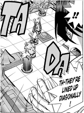 Then Yugi chuckles and says, “Take a good look at your monster’s positions on the field!”
