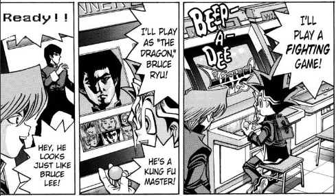 Yugi sits down at a fighting game and chooses Bruce Ryu as his fighter. The fighter is based on the famous Chinese action star, Bruce Lee.