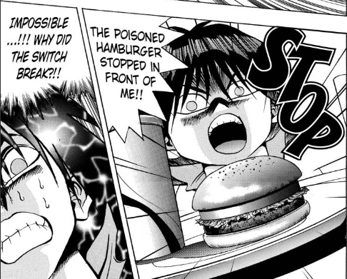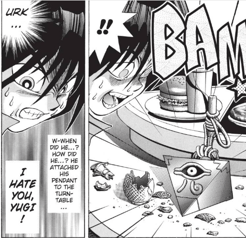 Mokuba realizes that Yugi came dangerously close to finding out that the bottle was actually a switch that allows him to stop the table wherever he wants. With being nervous that Yugi is on to him, Mokuba decides to make Yugi eat the next poisoned dish – the hamburger.