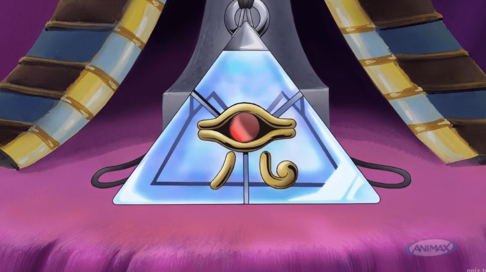 Yugi uses his typical strategy of summoning Kings Knight, Queens Knight, and Jacks Knight; and sacrificing the three of them to summon Slifer the Sky Dragon. Kaiba then plays a spell card called Obligatory Summon, which forces Yugi to summon his other two Egyptian gods – Obelisk the Tormentor and The Winged Dragon of Ra. Next, Kaiba activates one of the cards he got from Pegasus – a trap card eponymously named The Pyramid of Light. The text of this card reads, “All God cards on the field are removed from play.” Consequently, all of Yugi’s Egyptian gods get banished. After Kaiba activates The Pyramid of Light trap card, a massive replica of the artifact known as The Pyramid of Light appears around Yugi and Kaiba, preventing anyone else from viewing or interfering with the Duel.