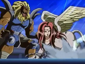 By and large, the role of Yugi’s friends are practically the same both films. When Yugi’s not dueling, they can be seen flanking him during their conversations, and perhaps providing support to our main hero during that time. That doesn’t stop them from getting involved in the action, however. In Dark Side of Dimensions, Joey and Bakura (the only of the bunch who isn’t in Pyramid of Light) take this on, each having their own encounter with Aigami’s powers. The stakes are high for both of them: Joey is trapped in his cube and must find a way out before the device obliterates him to gold dust, while Bakura is confronted by said villain over the death of Shadi, as shown in a flashback – to which he shows genuine sorrow for, leading Aigami to hesitate at killing him. TĂ©a and Tristan basically do absolutely nothing of note in this film; but it is Aigami’s companions that steal the spotlight for the supporting characters here.