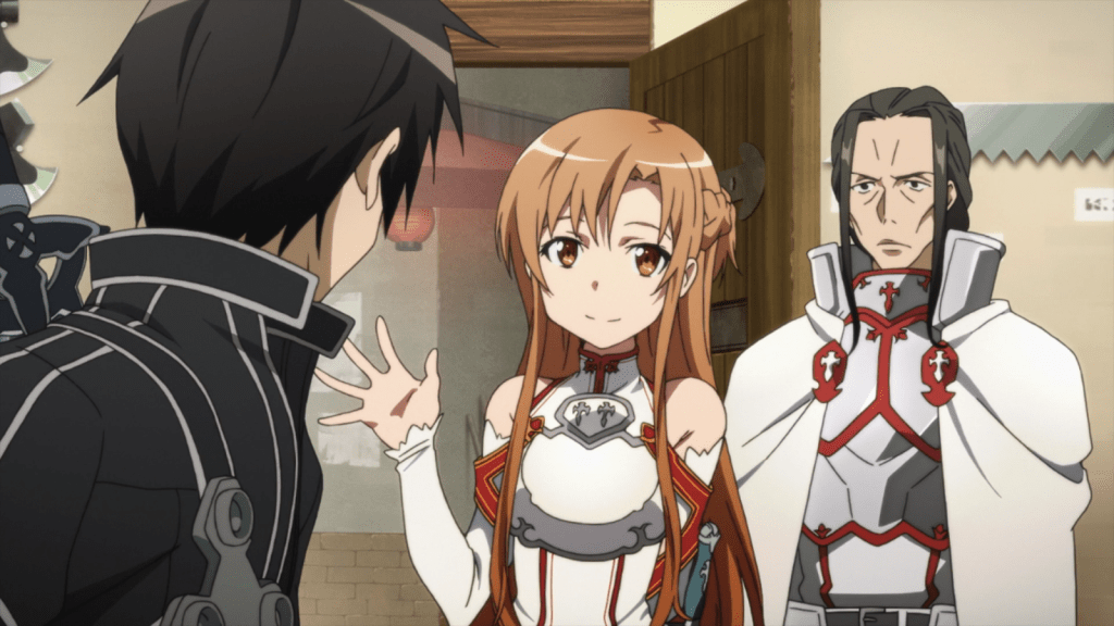 Asuna comes running into the room panting and tells Kirito she has some disturbing news; both of them have been summoned to the HQ of the Knights of the Blood Oath. Soon after, Kirito stands before the leader of the guild himself, Commander Heathcliff.