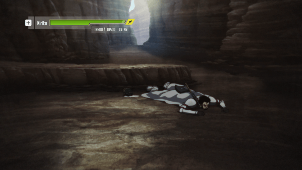 Kirito tries to pull the blade out, but he is too week to do it. Just as his HP bar is about to reach zero, a force comparable to a gust of wind comes rushing down the canyon. It makes contact with Kuradeel and sends him flying into the canyon wall. Kirito opens his eyes to see the Lightning Flash herself. Asuna quickly uses a crystal to heal Kirito to full strength. She explains that she was watching Kirito’s position on the map, but there was no response from Godfree, so she was worried that something happened.