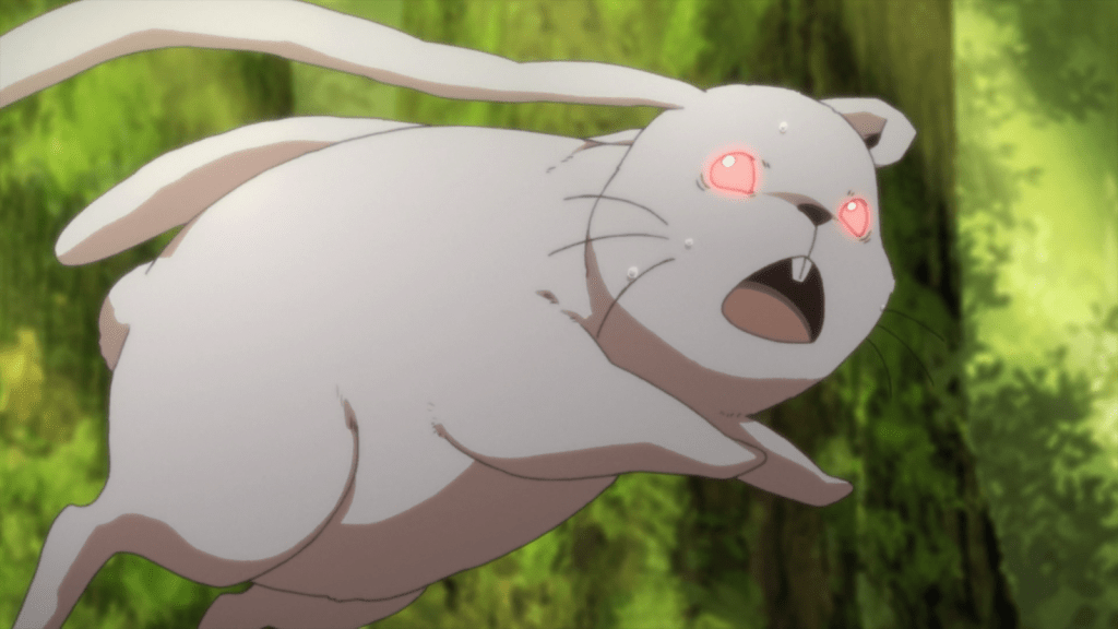 In the beginning of Episode 8, we see Kirito fighting a lizard monster while exploring the Floor 74 dungeon. The date is October 17, 2024. Kirito begins to wonder what Akahiko Kayaba is thinking as he watches over the world that he created. As he exits the dungeon and enters a forest, he hears something rustling in the bushes. Kirito turns his head and sees a pinkish-white rabbit with long ears. It’s name is “Ragout Rabbit”. Kirito pulls out his throwing needles and shoots them at the rabbit.