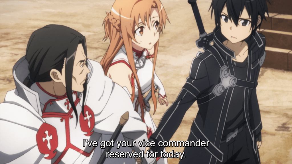 “Sorry, I’ve got your vice commander reserved for today,” declares Kirito, “I’ll take responsibility for Asuna’s security.”