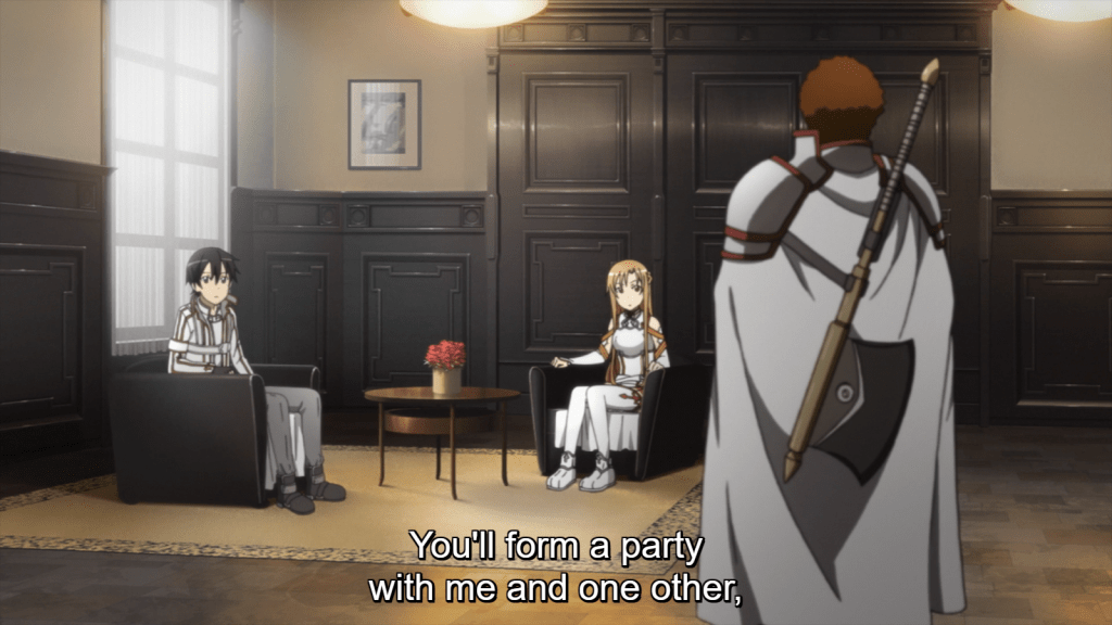 “Hey, Kirito,” calls Asuna, “I want you to tell me why you avoid guilds and other people.”