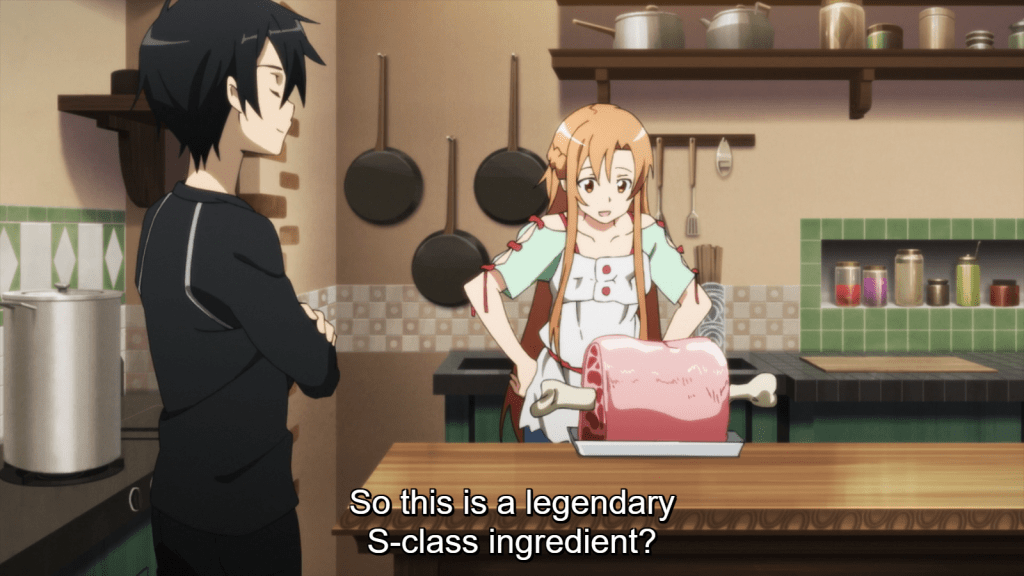 “Caught myself a chef!” cries Kirito as he clasps Asuna’s hands, “What’s your current cooking skill?”