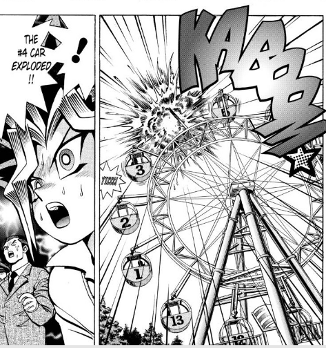 Yugi begins the game. He flips over the top card of the middle pile, and it turns out to be the 3 of spades. He places the card in the far right pile, as that is where the 3 o’clock position is on a clock’s face. Next, Yugi draws a card from the 3 o’clock pile. It’s the 4 of hearts. He places it underneath the next pile clockwise. The next card is the 10 of diamonds, then the 4 of diamonds. Yugi keeps playing the game until he finally completes one of the piles – the 4 o’clock position. Suddenly, one of the cars on the Ferris Wheel explodes! It was the car labeled with the number 4.