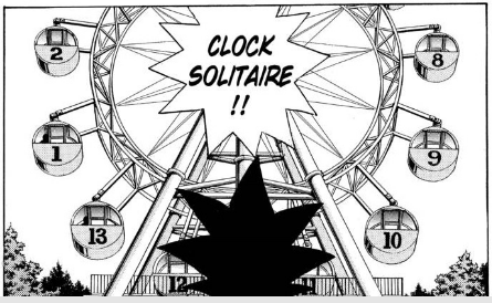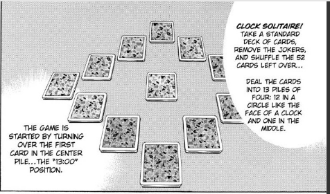 The game will be played like a regular game of Clock Solitaire. Yugi is to shuffle the deck of 52 cards and create 13 piles of 4 cards and arrange 12 of the piles in a circle, and place the last one in the middle. The game begins by flipping over the top card of the middle pile and moving it to the bottom of the pile that corresponds to its position on a clock face, with Jacks as 11’s, Queens as 12’s, and Kings being placed in the middle. Then, Yugi is to flip over the top card of the pile he just added a card to and repeat the process. The game ends when all four Kings are face-up in the middle.