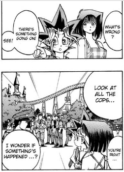 After going on a few more rides, Yugi and Anzu notice a group of police officers standing in the middle of the park.