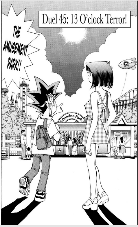 After discovering the true identity of “the one who saved her with a game,” Anzu is at it again trying to win the heart of Yugi’s alter-ego. This time, Anzu has brought Yugi to an amusement park, but Yugi has his face buried in the newspaper.