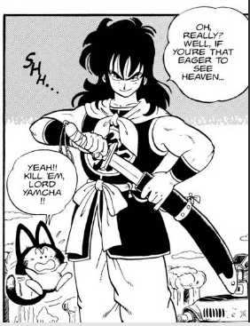 “Where did you get that staff, boy?” asks Yamcha.