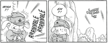 Meanwhile, off in the distance, Oolong begins to feel a great disturbance down south. His stomach starts growling, then it moves to his nether regions, then Oolong has to take a dump behind a bush.