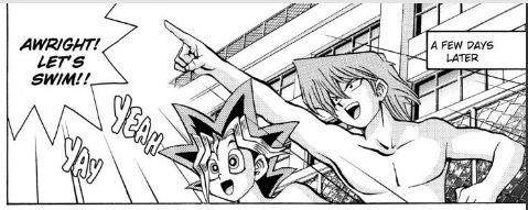 A few days later, Yugi and Jonouchi go for a swim at the pool. When Yugi returns to the cubbies, he notices that his Millennium Puzzle is missing. In its place is a note that reads, “If you want your puzzle back, come by yourself to room ‘C’. Don’t tell anyone about this. (If you do I’ll ditch the puzzle!) – Messenger of Darkness”