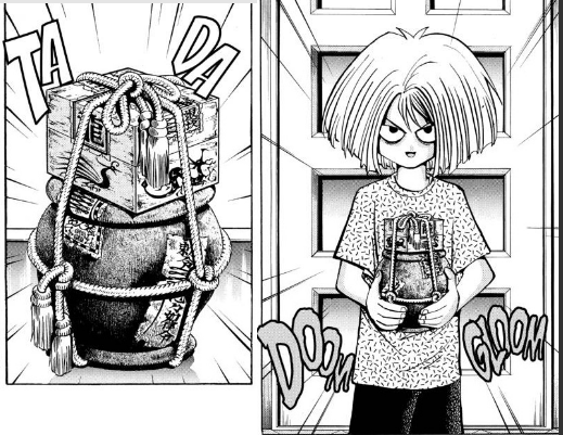 Yugi, Jonouchi, and Anzu are visiting Grandpa’s game shop, where Grandpa Muto is showing them a game from ancient Egypt, when an unexpected visitor arrives. Yugi recognizes him as Imori from his class. Imori has come to the Kame Game shop to get a game from his family’s collection identified. The game, which he is holding in his arms, was obtained by his grandfather when he was in Manchuria during World War II. Imori discovered it in his shed recently. It appears to be a wooden box on top of an urn, all held together by a neatly tied rope. Jonouchi asks Imori if he can open the seal, but Grandpa screams at Jonouchi not to open it.
