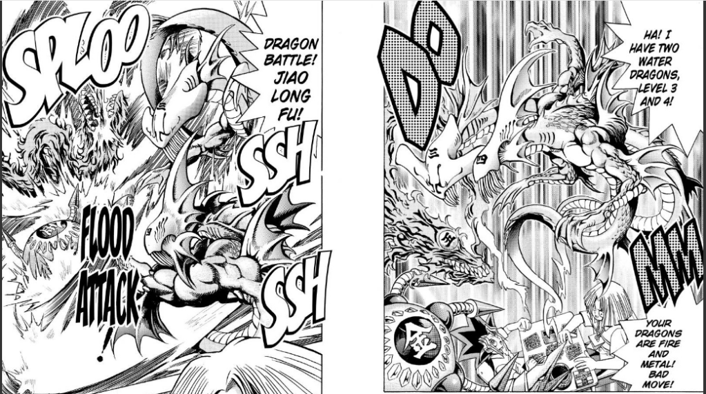 “Dragon Battle! Jiao Long Fu!” cries Imori, “My flood washes Yugi’s dragons away! You know what’s next, Yugi! Penalty Game! You have to give the dragons your soul!”