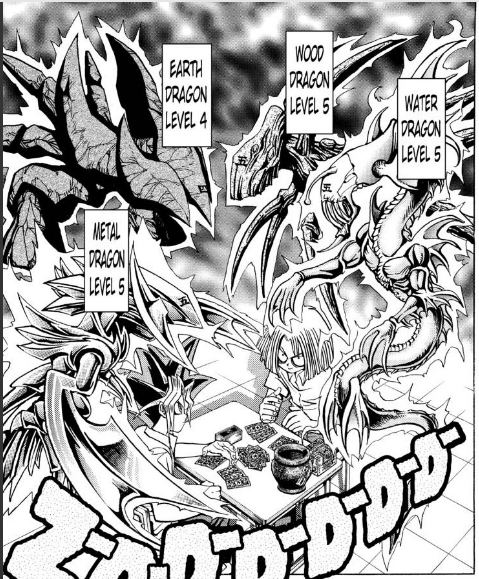 Imori summons two dragons first. Yugi summons his shortly after. On Imori’s side is a level 5 Water Dragon and a level 5 Wood Dragon, and on Yugi’s side is a level 4 Earth Dragon and a level 5 Metal Dragon.