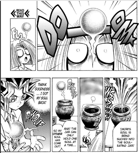 “There is only one way to replace the seal on the Dragon Cards. The loser of the game must offer his soul to this soul-bating jar to calm the wrath of the cards. Yugi, don’t try to back out! You can’t escape the Dragon Cards!