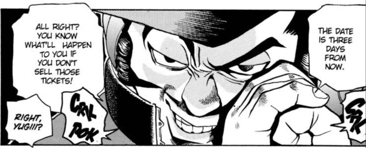 Sozoji orders Yugi to sell 10 tickets for show. They are 2,000 yen each. The date is three days away. Sozoji cracks his knuckles and says, “You know what’ll happen to you if you don’t sell those tickets!”