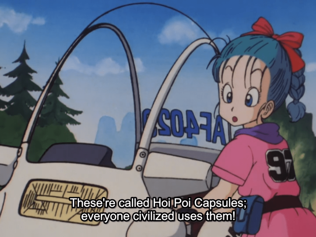 Goku asks Bulma how she plans on finding the rest of the dragon balls. She pulls out a device that looks like a big stopwatch. Bulma says this device is a radar that allows her to pinpoint the exact location of each ball. The next one is quite some distance away, so she pulls out another fantastic contraption in the form of a small capsule. She presses the button on the top and tosses it. It explodes and turns into a motorcycle. Bulma says this invention is called a Dino Capsule, and everyone in the city has them.