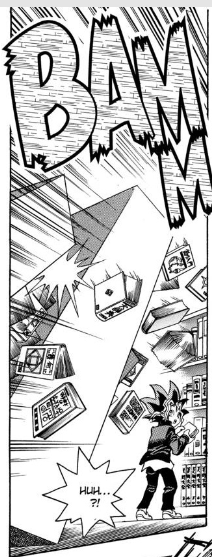Yugi arrives at the library and searches for the book’s location. Suddenly, he starts to hear loud banging noises getting louder and louder. He looks behind him just in time to see the bookshelf falling over! Yugi’s near-fatal accident causes him to transform into his alter-ego. (I guess the Millennium Puzzle protected him from that too.)
