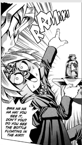 “Now what?” asks Yugi, “You can’t yank any more out. There is only one way to remove a page! If you’re really psychic, you can levitate the bottle!”