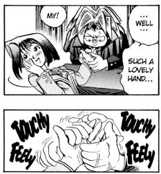 The room cheers for Kokurano’s amazing abilities. Anzu becomes infatuated and decides to get her fortune told after all. She steps up to the booth, but Kokurano begins to rub her hand, which makes Yugi pissed.