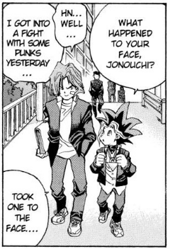 At the beginning of chapter 5, Yugi and Jonouchi are walking to school together when Jonouchi tells Yugi he wants to improve his luck. The reason why is because he got into a fight with four other guys and still managed to take a hit, but Yugi thinks getting hit once while fighting four other guys is lucky. Out of nowhere, a part from a power line hits the ground right in front of Jonouchi. (What is this, Road Runner?) Yugi is starting to see Jonouchi’s point.