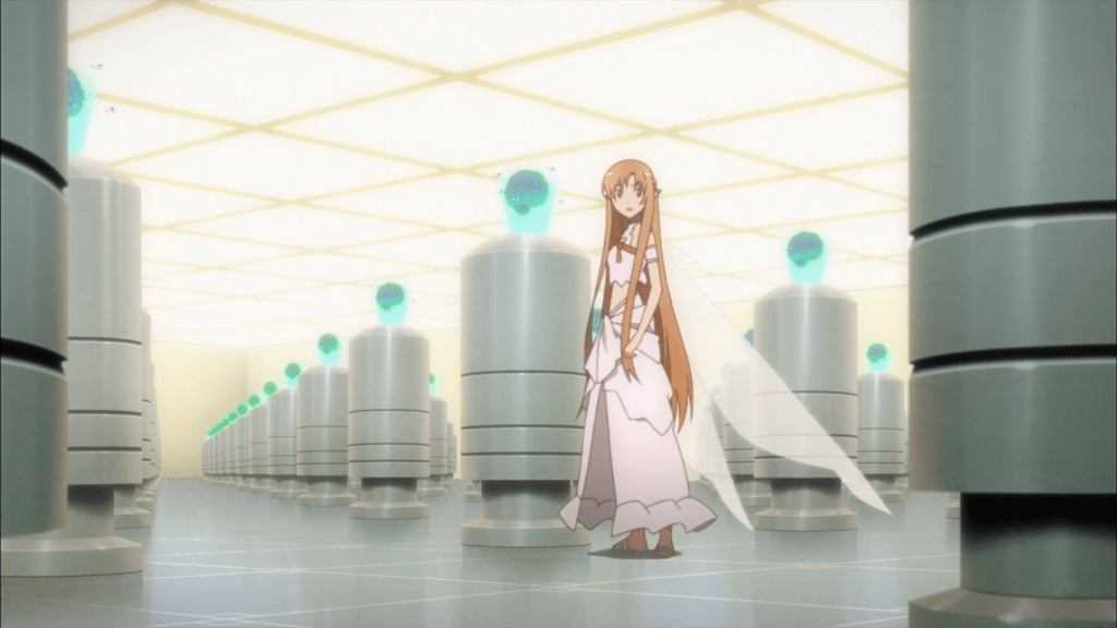 Asuna enters the experiment room and sees rows and rows of small pedestals, each displaying a hologram of a brain above it. Each of these brains belongs to one of the 300 SAO survivors. To Asuna’s horror, the holograms show they are experiencing pain, terror, and all sorts of trauma.