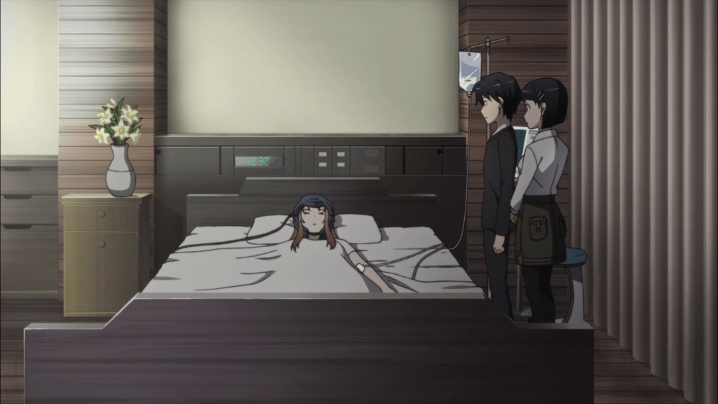 They get on the bus and head for the hospital. Sugu asks Kirito what his plans for restarting school are. He heard one of the schools in the city has been designated for SAO survivors, but he is concerned because it sounds like they are just trying to observe how the incident affected their minds. They finally reach the hospital, which Sugu says is very big. They take the elevator up to Asuna’s hospital room where Sugu reads the name on the plate.