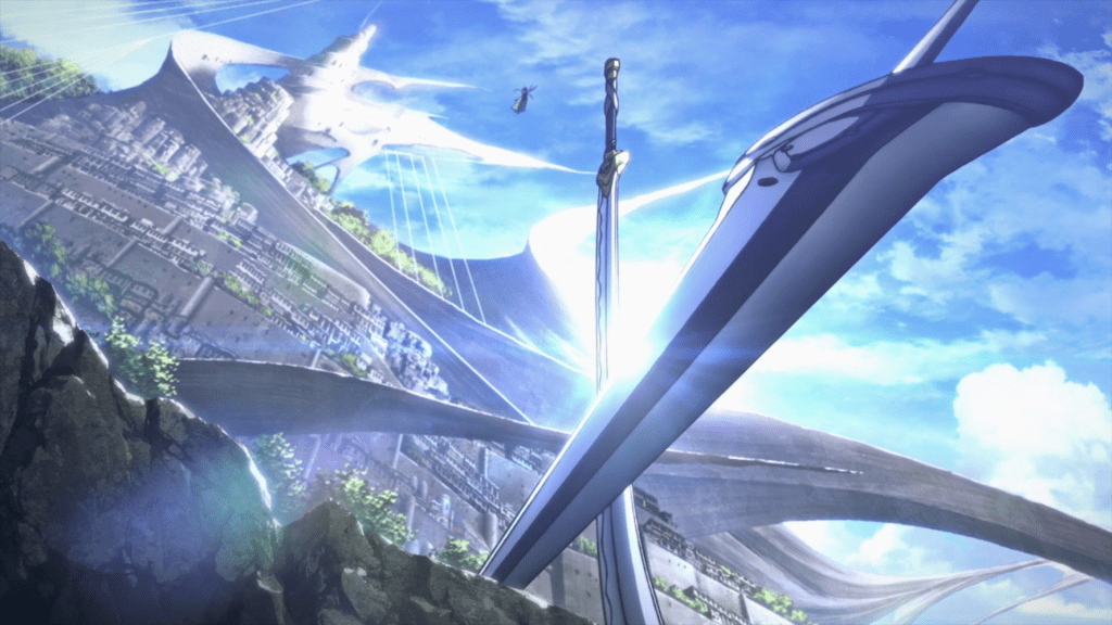 Leafa finally realizes where he got his weird stance from. She strikes first and misses. Kirito responds and misses. The two fairies begin flying and zipping through the columns of the terrace. Leafa flies high in the air and lands on a floating island, holding her sword high above her. She lets herself fall off the island. Kirito ascends, but when Leafa comes within striking distance, she lets go of her sword. Kirito catches her, dropping his sword in the process, and the two begin spinning in mid air.