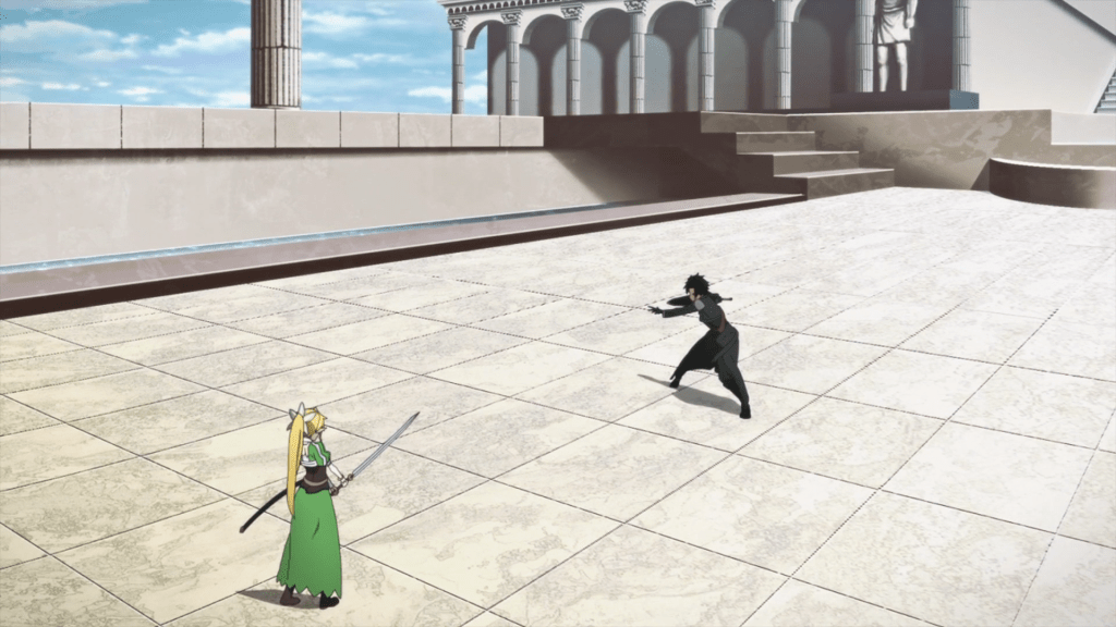 Leafa finally meets Kirito on the north terrace. Kirito is about to say something, but Leafa stops him and challenges him to a duel. (Not with cards, but with swords.)