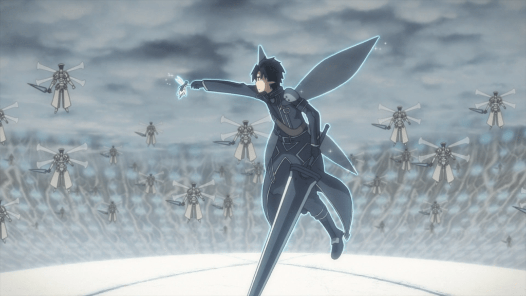 Suddenly, an arrow pierces Kirito’s hand. He looks around the room and sees archer guardians surrounding him with their bows drawn. They all fire their arrows at once. Kirito gets pierced by all of the arrows, but keeps pursuing. As if the arrows weren’t bad enough, the next thing Kirito gets pierced by is a whole big dagger, about as big as Kirito’s sword. After the dagger pierces him, ten more follow. Kirito keeps pushing towards the gate, but his HP is falling fast. In one final act of desperation, he reaches for the gate…as his HP bar falls to zero.