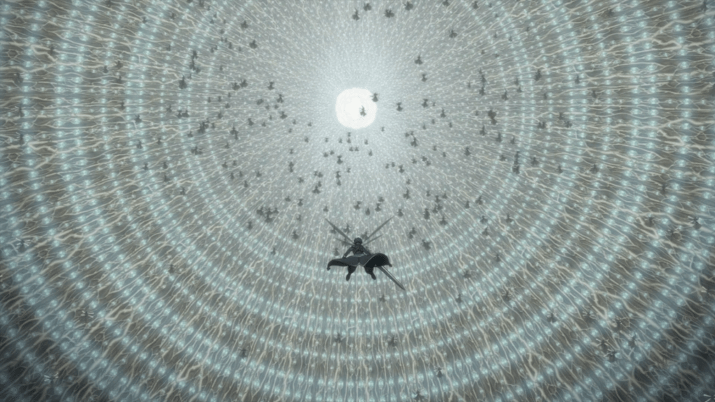 The interior of the World Tree is a massive cylindrical room. At the very top is a stone gate, which Kirito identifies as the goal. He immediately begins charging upwards. Scattered around the walls of the room are thousands of pods embedded into the wall. A guardian comes out of one of the pods and engages Kirito. The swordsman clad in black slices the guardian’s head off with ease. Following the guardian’s defeat, a hundred more come out of the walls. Kirito slashes at all of them, but for every guardain he defeats, another comes to face him.
